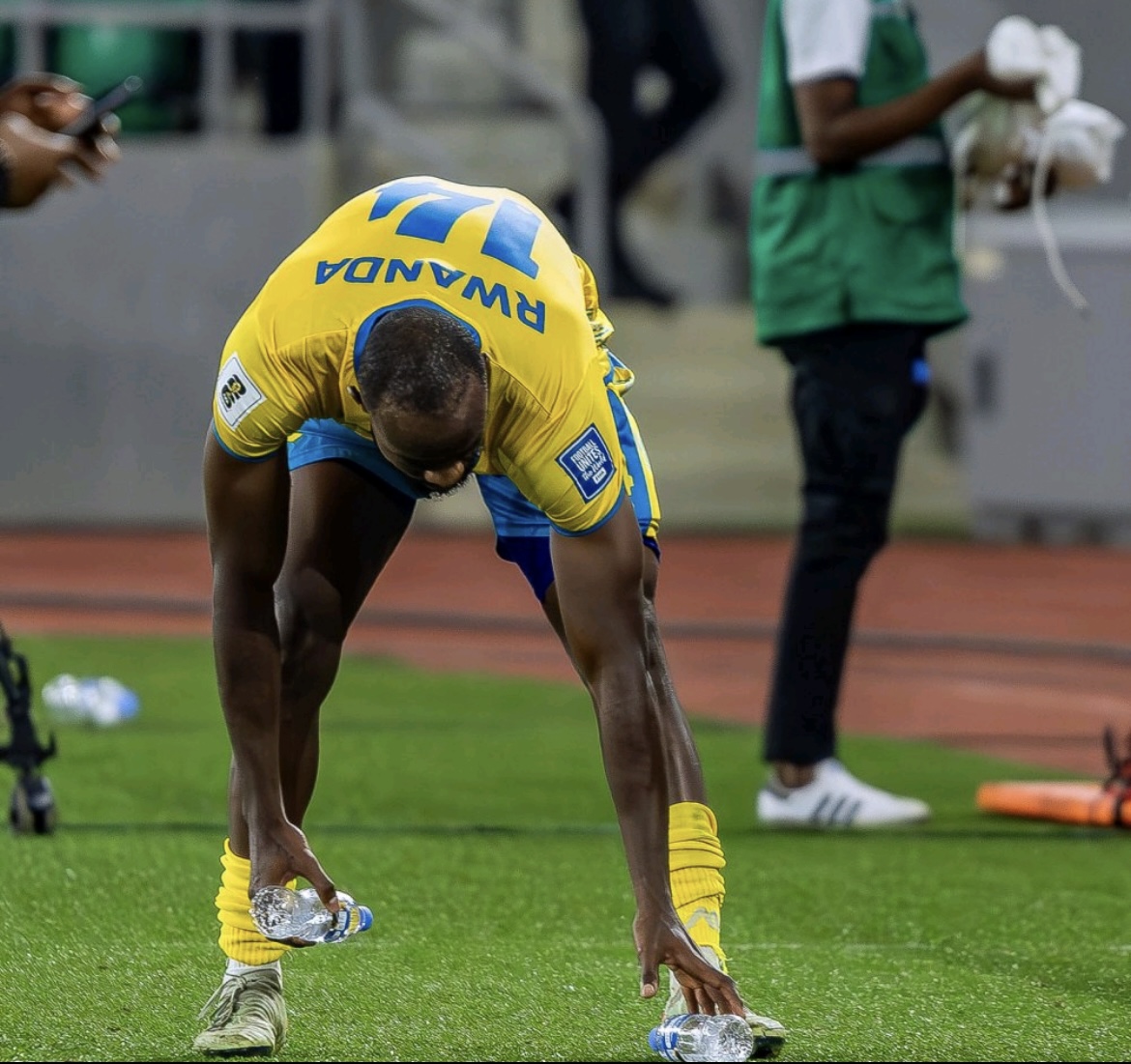 Myugariro w’Ikipe y’Igihugu ‘Amavubi’, Phanuel Kavita, yatunguranye aho yagaragaye atoragura uduca tw’amazi twakoreshejwe n’abakinnyi nyuma yaho Benin itsinze Amavubi.